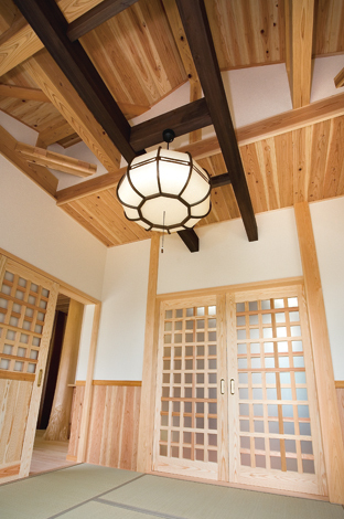 高い勾配天井に太い梁を渡して 照明をつり下げている 変化に富んだダイナミックな空間が生まれた イエタテ